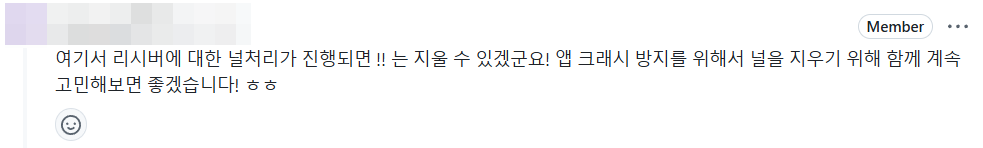 앞으로 코틀린 코드를 작성할 때 null 사용을 최소화하여 프로그램의 안정성을 올리는 방향으로 작성해야겠다.