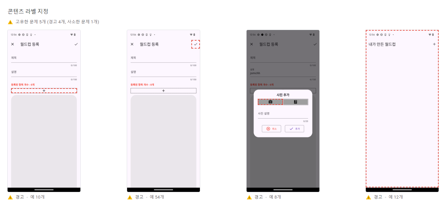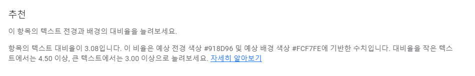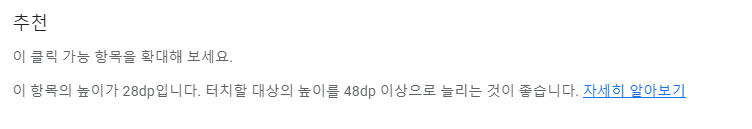 버튼의 크기가 너무 작다거나 터치 요소의 크기가 권장사항보다 작아서 경고를 주는 부분도 있었다.