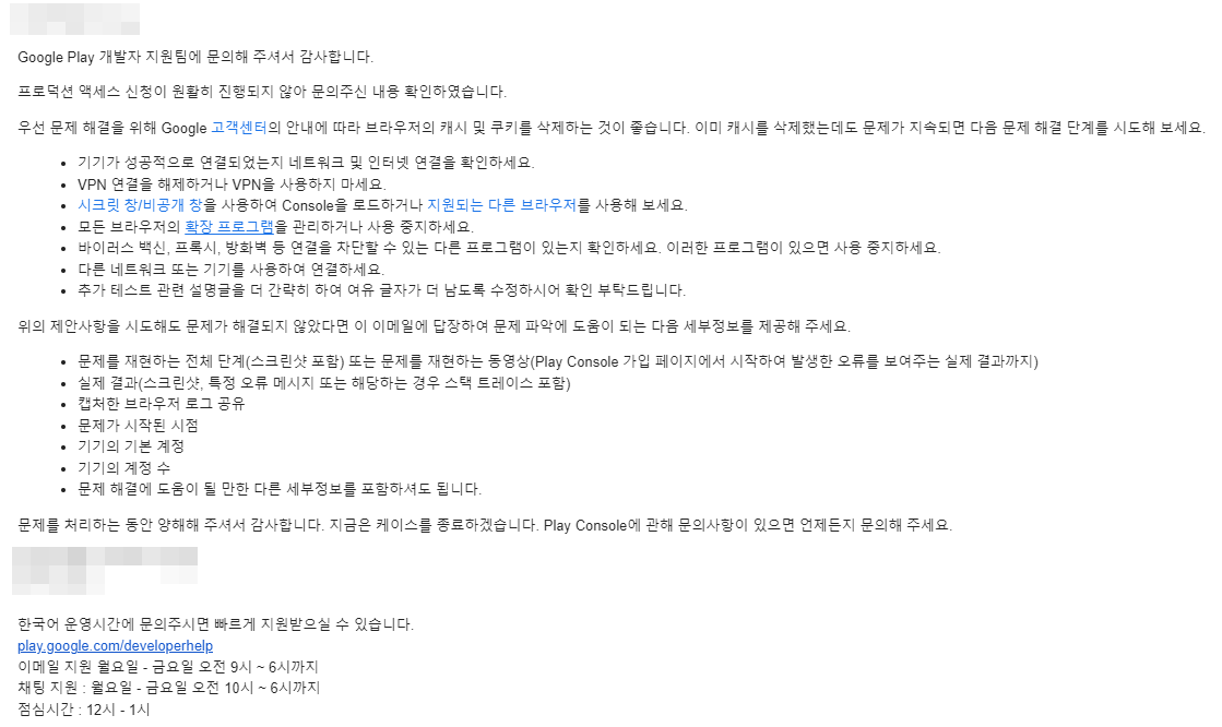 Google Play 개발자 지원팀에 문의를 남겨보니 아래와 같은 답변을 받았다.