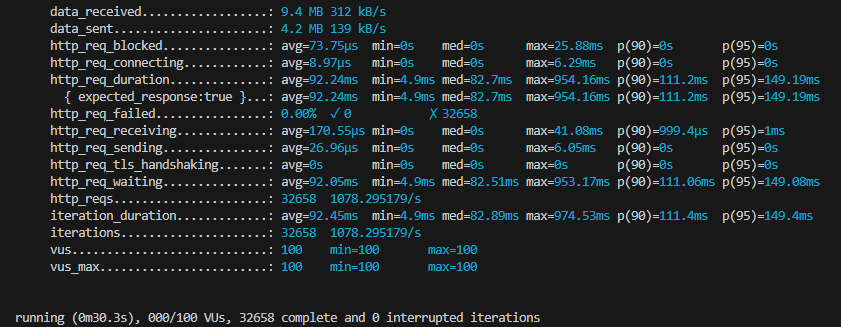 30초간 100명의 사용자로 동시 요청 테스트를 진행한 결과 32658번의 요청에 대해서 모두 성공적이었다.