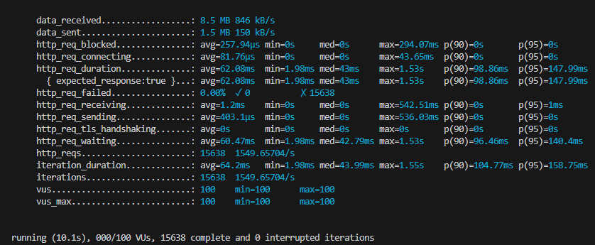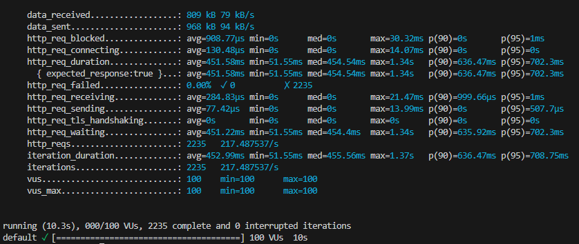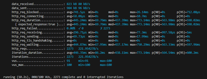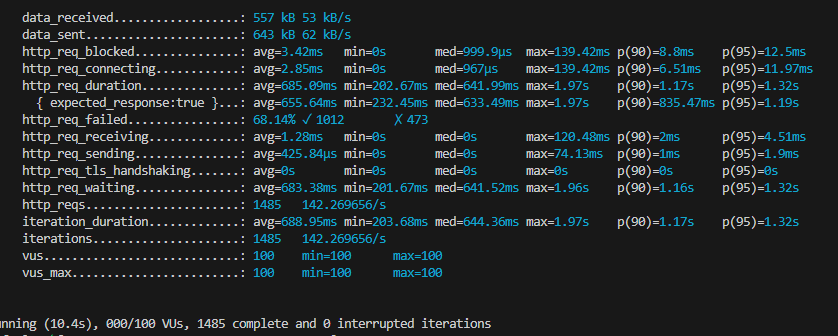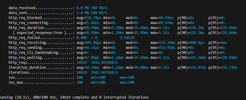 1310개의 요청을 모두 성공하였고, 좋아요 수도 1310개로 정확하게 올랐다. 정합성과 성능의 어느 중간선을 만족한 것 같아서 나쁘진 않지만, 확실히 사용자가 아무생각없이 누를 수 있는 좋아요 기능에 대해 성능이 별로가 아닌가하는 생각이 든다.