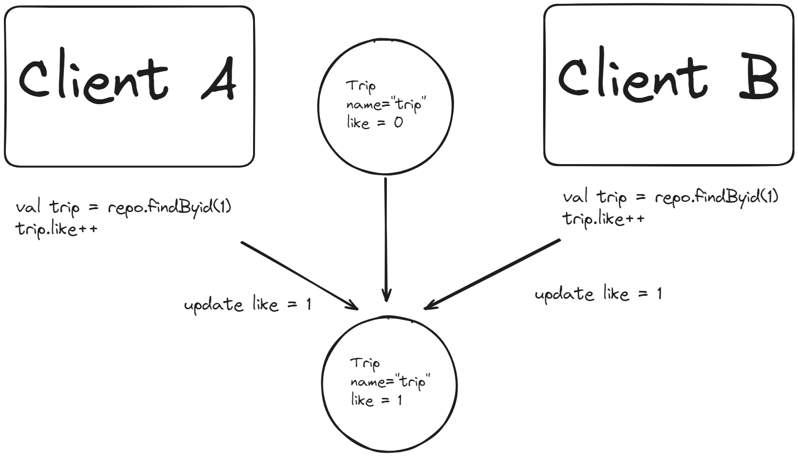 아래 그림으로 설명한 것과 같이 동시에 조회한 좋아요개수가 같은 두개의 요청에 1을 더한 결과가 같게 업데이트되기 때문에 이러한 문제가 발생한다.