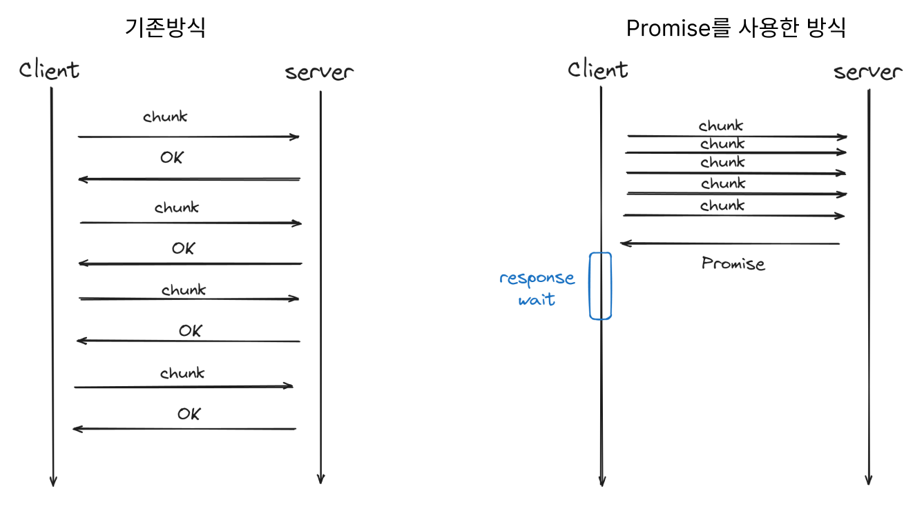 기존에는 Chunk들을 순차적으로 보내는 방식을 사용했었다. 이번에는 모든 Chunk에 대한 요청을 동시에 보내고 Promise를 통해 다 보내지면 그 다음 동작을 하도록 나누어 보았다.