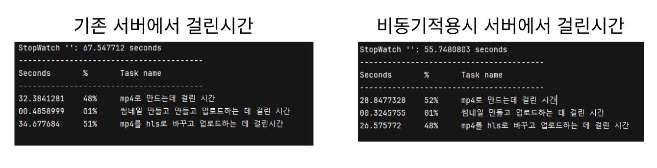 html코드에서 로그를 찍어보니 모든 Chunk를 업로드하는데 걸리는 시간이 약 2.5초 정도 걸리고 최종적으로 걸리는 시간은 10초정도로 나왔다. 그렇다면 s3에 접근해서 모든 Chunk를 mp4로 변환해서 hls파일로 변경후 다시 S3에 업로드하는 과정에서 대략 8초정도 걸린 것을 알 수 있다.