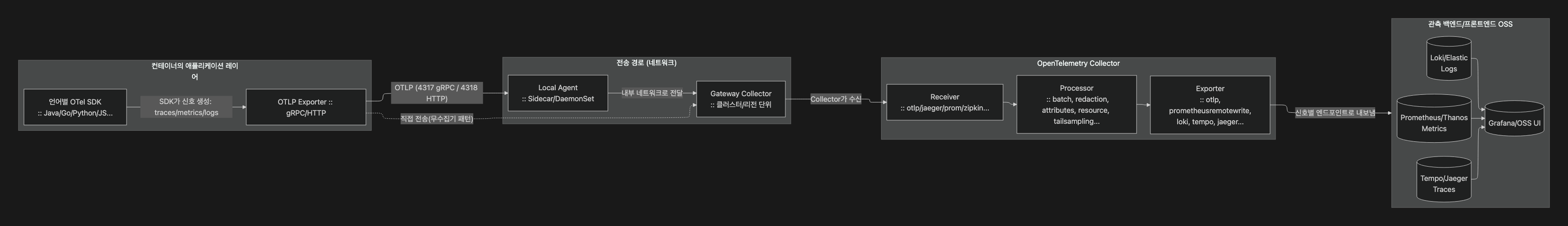 gRPC(4317) 또는 HTTP(4318) 로 Collector의 OTLP endpoint에 보낸다.