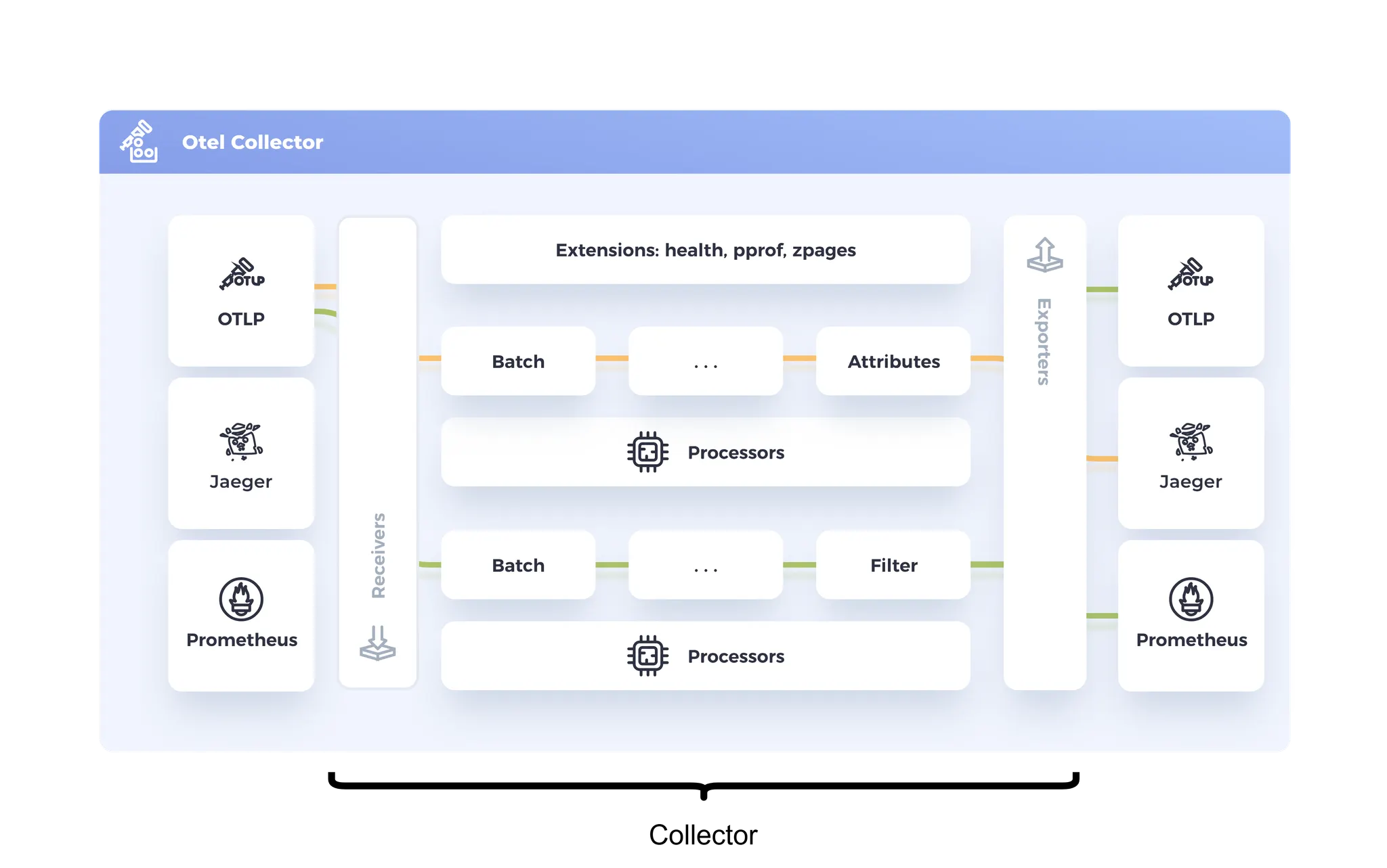 **필터 역할만 하는 게 아니라 backpressure 역할(batch, memory_limiter), 라벨링 (attributes, resource), 라우팅(routing) 등등을 처리한다.