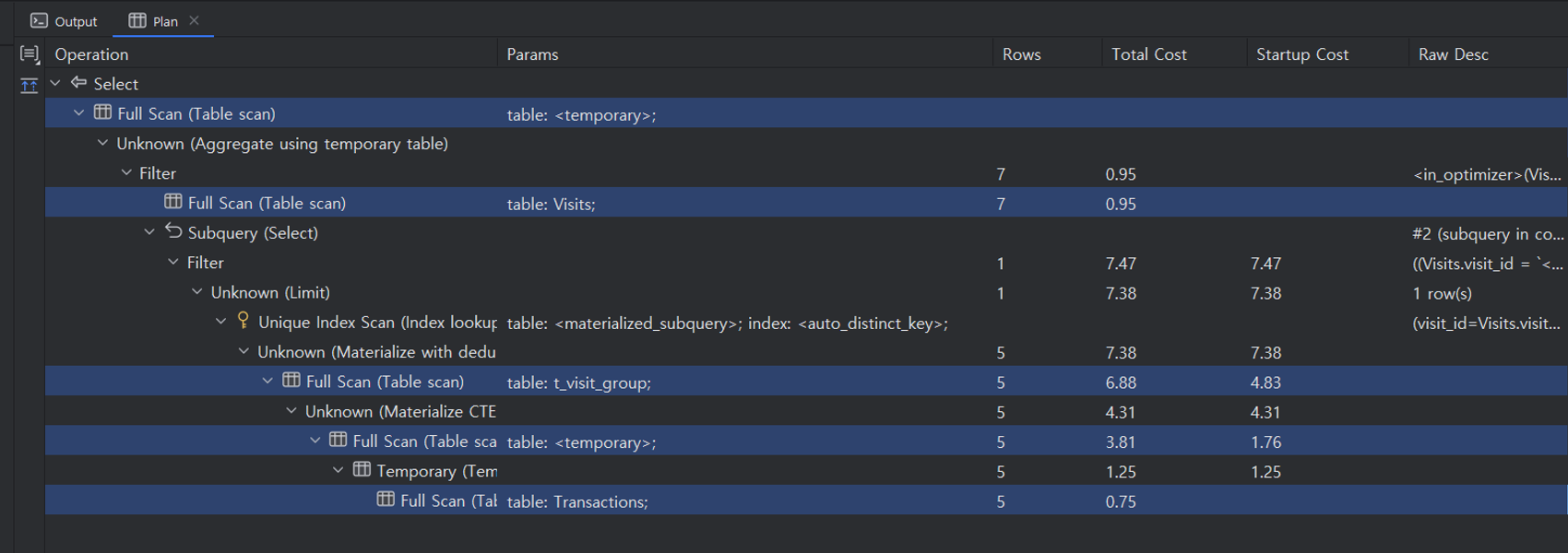 FILTER (filter) 1 7.47 7.47 ((Visits.visit_id = `<materialized_subquery>`.visit_id))