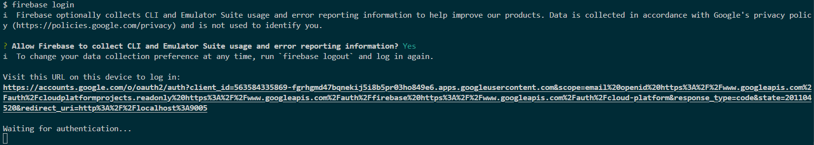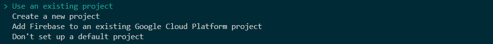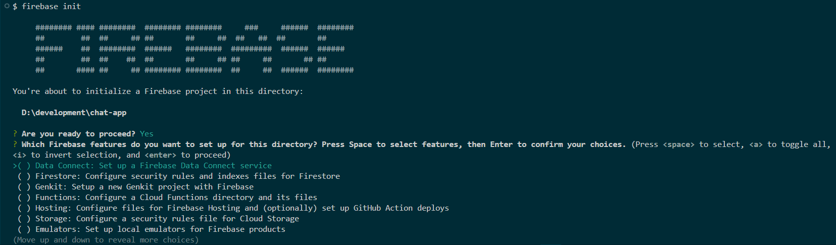 firebase init 명령어를 터미널에서 실행하면 아래와 같은 화면이 출력된다.