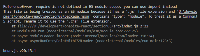require 함수는 ES module의 함수가 아니다. import를 대신 사용하라는 에러 메세지