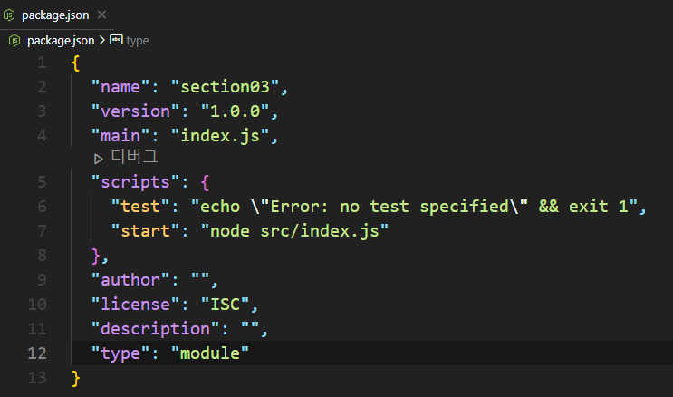 name에 작성된 해당 패키지(section03)는 ES Module System을 사용하도록 하는 설정.