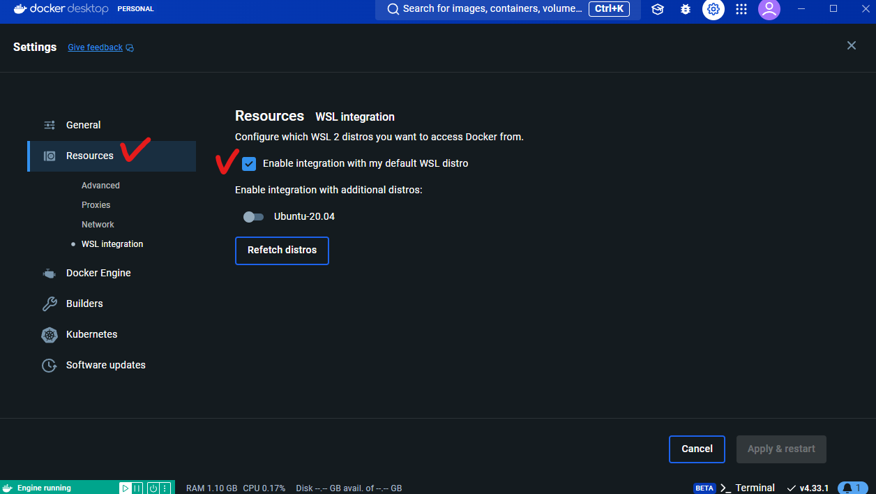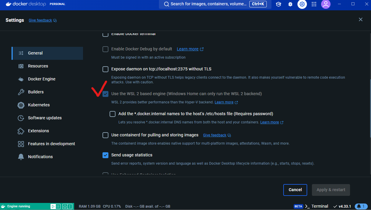 Use the WSL 2 based engine이 체크되어 있는지 확인합니다.미리 체크가 되어 있지 않았다면, 체크하고 우측 하단의 Apply & restart 버튼을 누릅니다.
