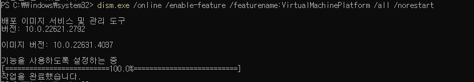 dism.exe /online /enable-feature /featurename:VirtualMachinePlatform /all /norestart