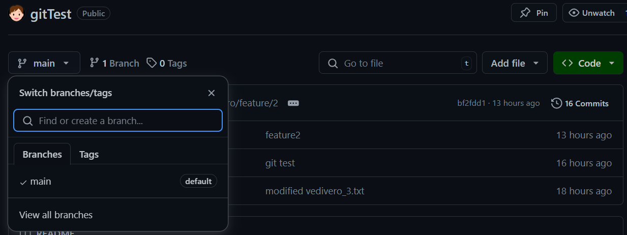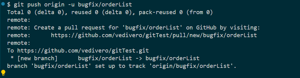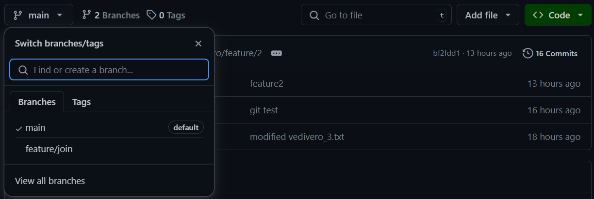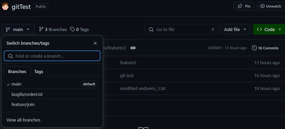 브랜치 목록을 조회 하면, 해당 브랜치가 성공적으로 생성되었습니다.