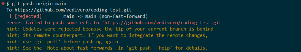 로컬 브랜치가 원격 브랜치의 최신 커밋을 반영하지 않았기 때문에 발생. 즉, 로컬 main 브랜치가 원격 main 브랜치보다 뒤에 있어 git push를 할 수 없는 상황.