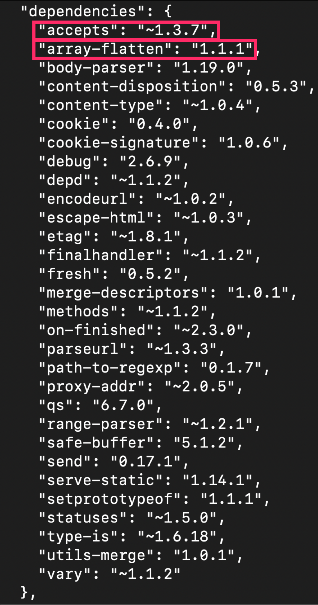 이전 노트에서 본 express 패키지의 package.json 파일의 dependencies 필드를 살펴봅시다.