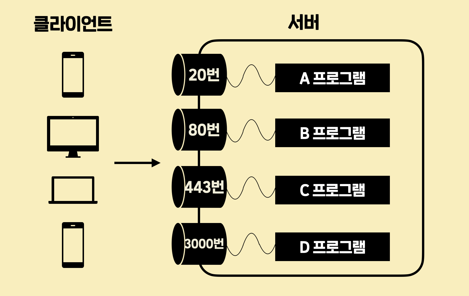 지금 서버에서 각 프로그램이 서로 다른 포트 번호를 할당받아서 실행되고 있죠? 이럴 때 클라이언트는 원하는 프로그램의 포트 번호를 지정하고 접속하면 됩니다.