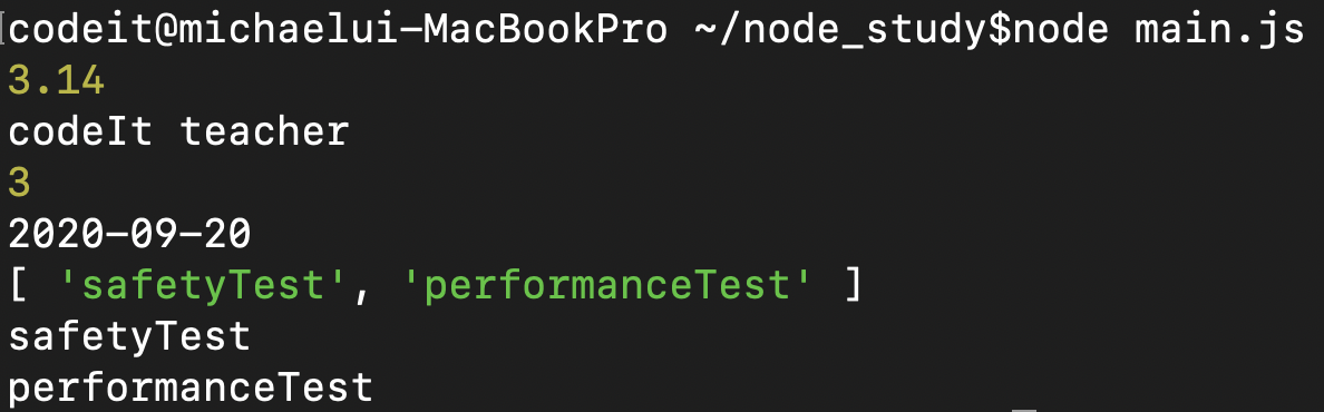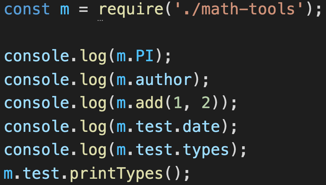 변수(author), 상수(PI), 객체(test)를 추가하고 맨 아래에서 exports 키워드로 이것들을 하나씩 다 공개해주었습니다.