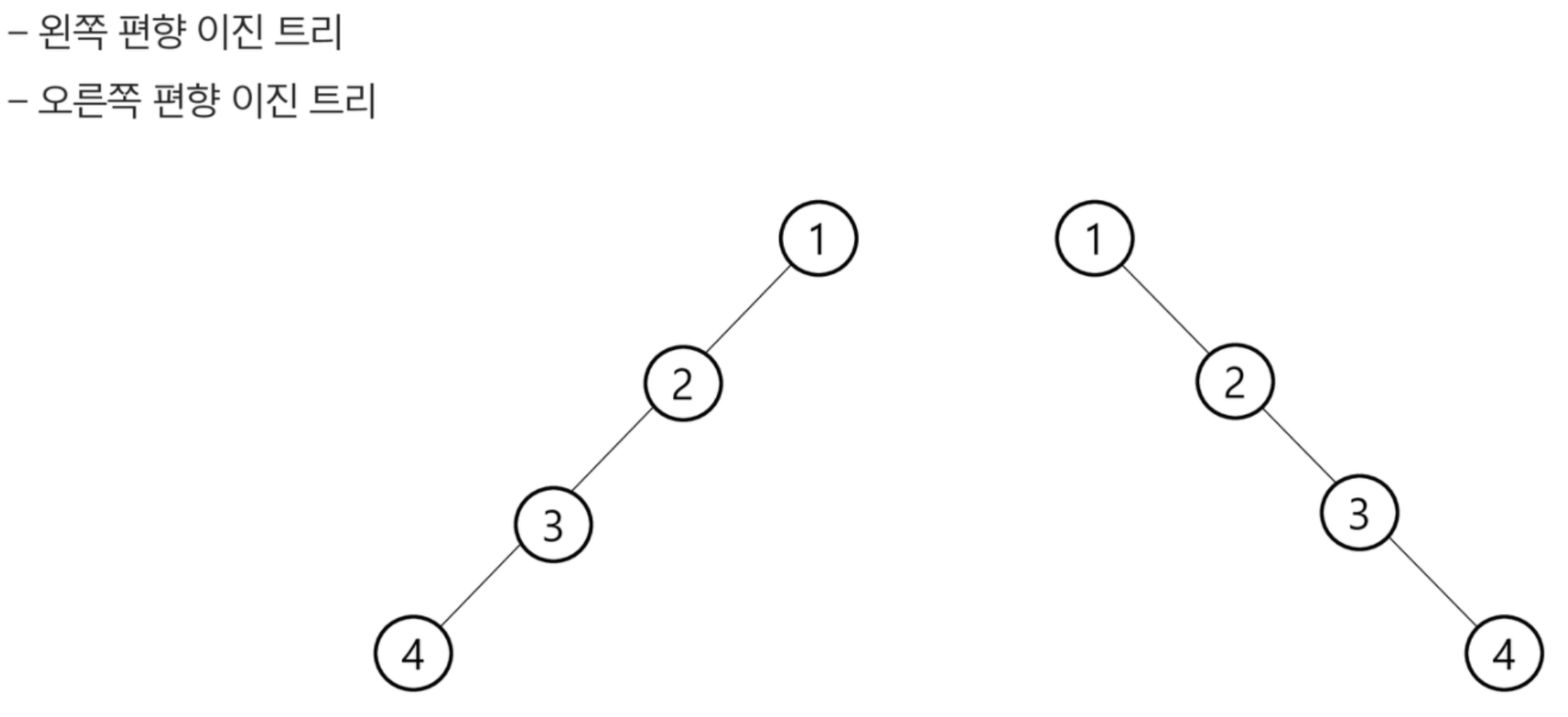 - 높이 h에 대한 최소 개수의 노드를 가지면서 한쪽 방향의 자식 노드만을 가진 이진 트리