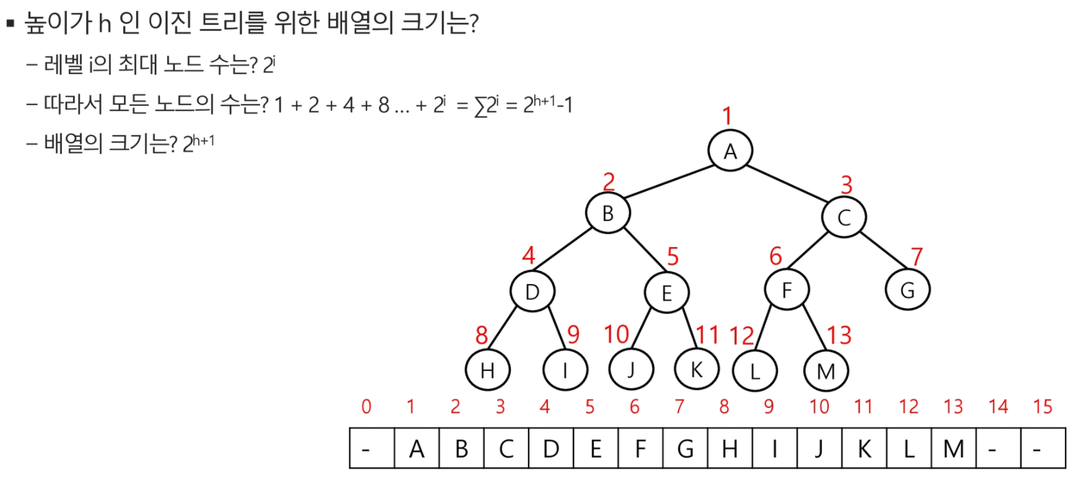 - 트리의 중간에 새로운 노드를 삽입하거나 기존의 노드를 삭제할 경우 배열의 크기 변경이 어렵다.