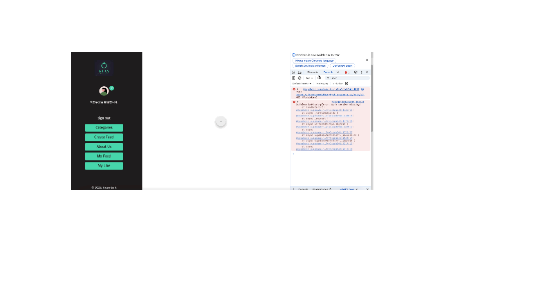 에러 메시지를 확인한 결과, AuthSessionMissingError: Auth session missing 오류가 발생했다.
