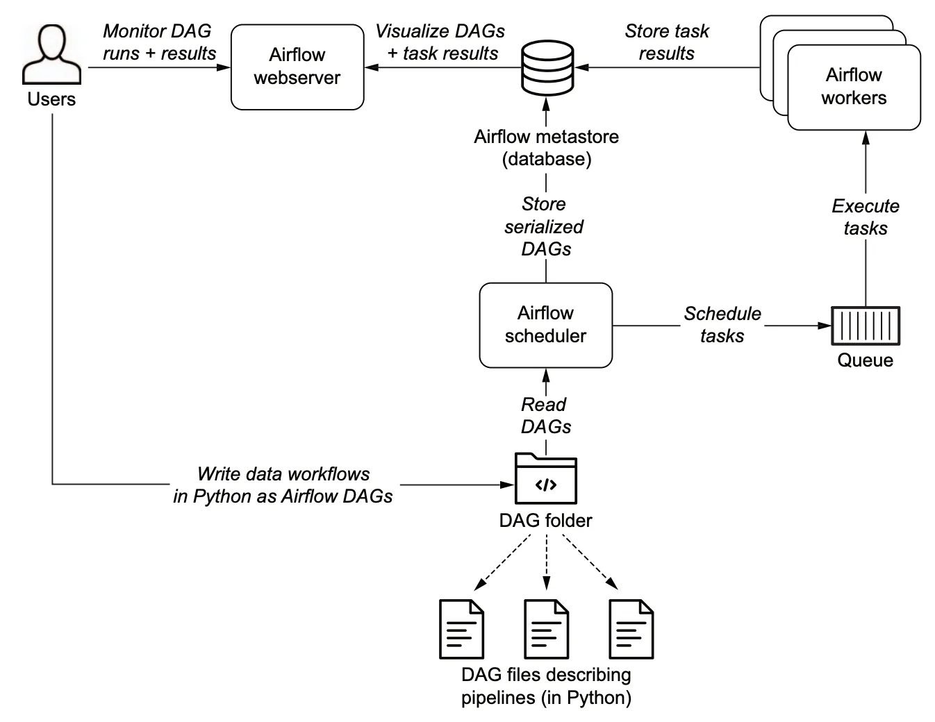 모든 컴포넌트들은 python application이다. 추가로 패키지를 설치할 수 있으며, 이는 custom operators or sensors를 설치하고 custom plugin을 통해 airflow 기능을 확장하기에 좋다