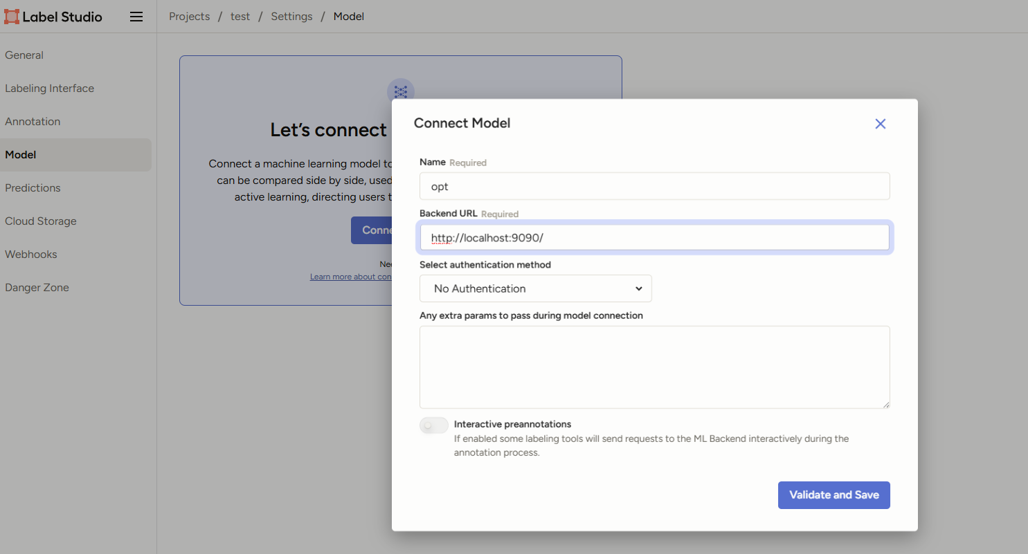 프로젝트 안에 모델 등록. project > settings > Model > Connect Model을 선택한후, 등록하고 싶은 모델 이름과 Backend URL을 설정하고 저장한다. http://localhost:9090/health 와 같이 해당 url이 유효한지 확인하고 저장이 완료된다.