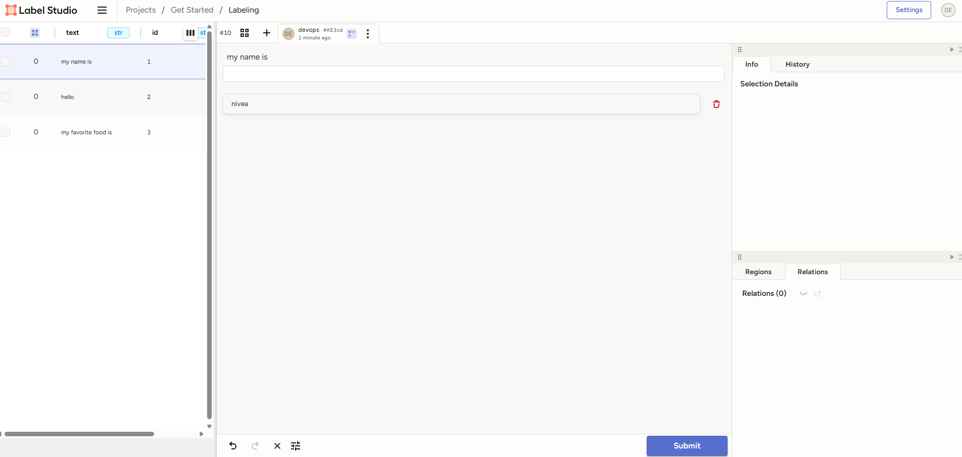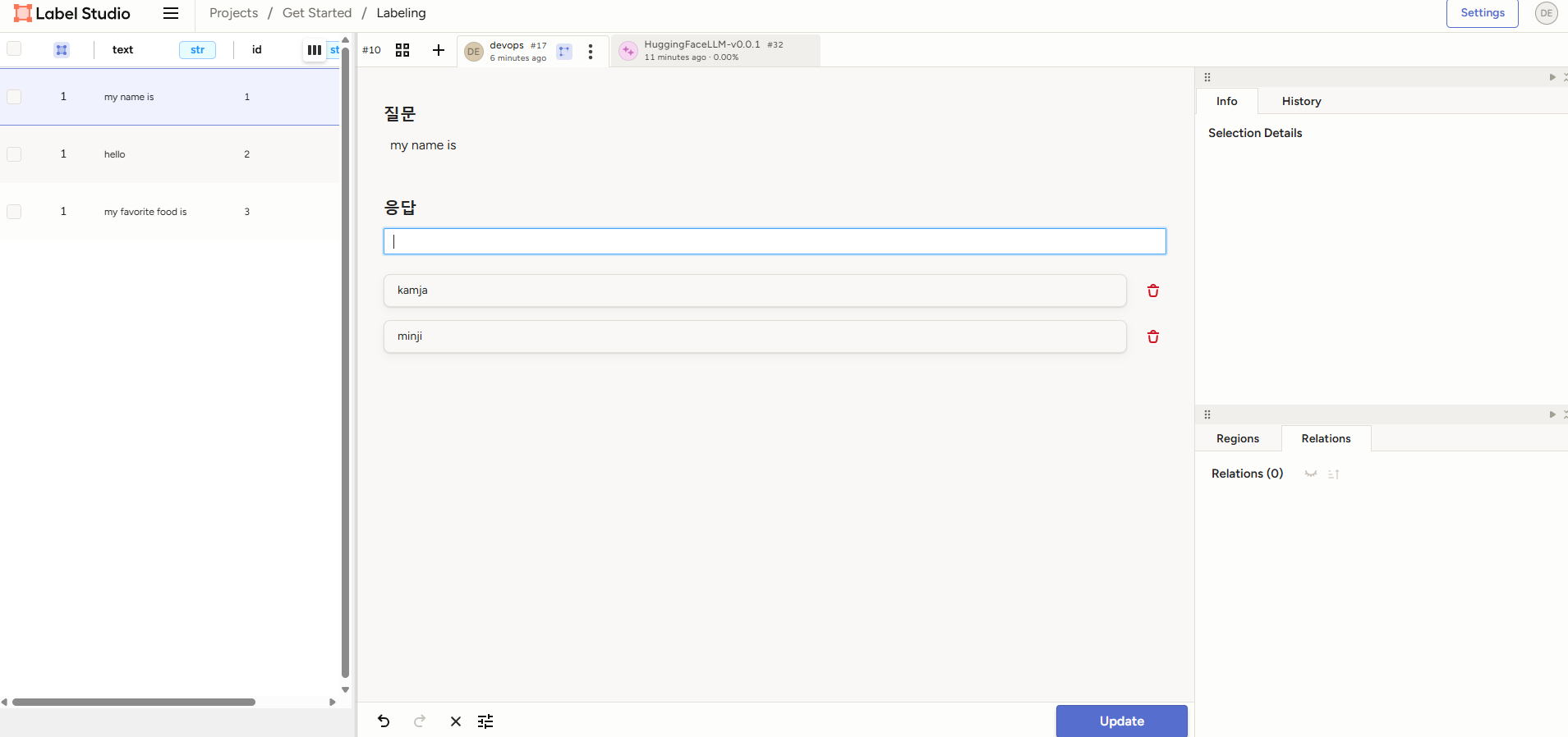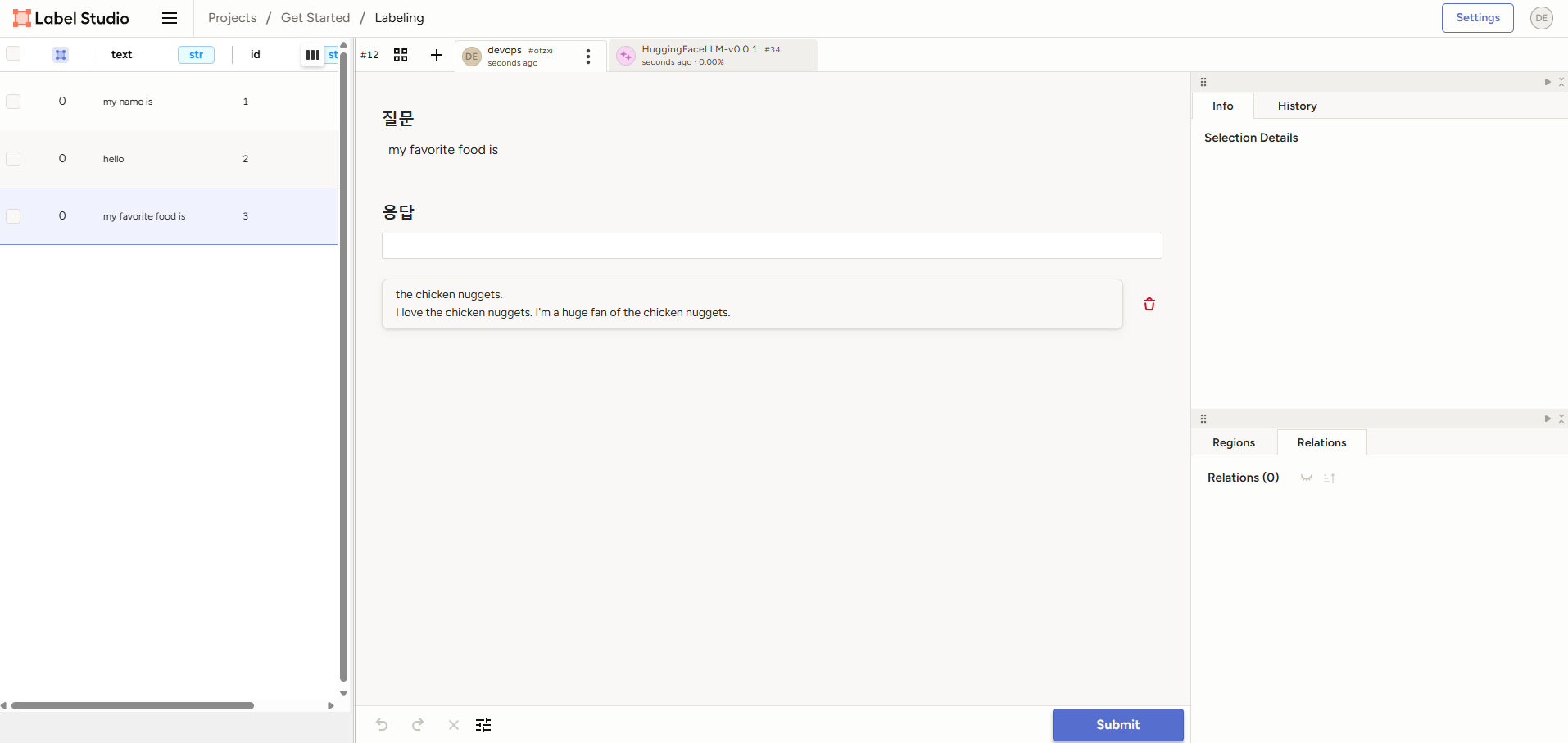 text) 데이터를 설정된 모델의 입력으로 넣어, 모델의 예측 결과를 반환받을 수 있다. 우선 label-studio-ml-backend을 통해 모델 api 배포 및 모델 연결을 미리 해야한다.submit을 누르면 저장이 된다. 이때 예측 모델의 이름은 HuggingFaceLLM-v0.0.1가 된 이유는 model.py를 통해 model_version을 이와 같이 정의하였기 때문이다.
