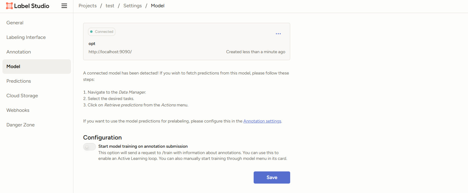 프로젝트 안에 모델 등록. project > settings > Model > Connect Model을 선택한 후 등록하고 싶은 모델 이름과 Backend URL을 설정하고 저장한다. http://localhost:9090/health 와 같이 해당 url이 유효한지 확인하고 저장이 완료된다. 아래 사진은 연결이 완료된 후 화면이다.