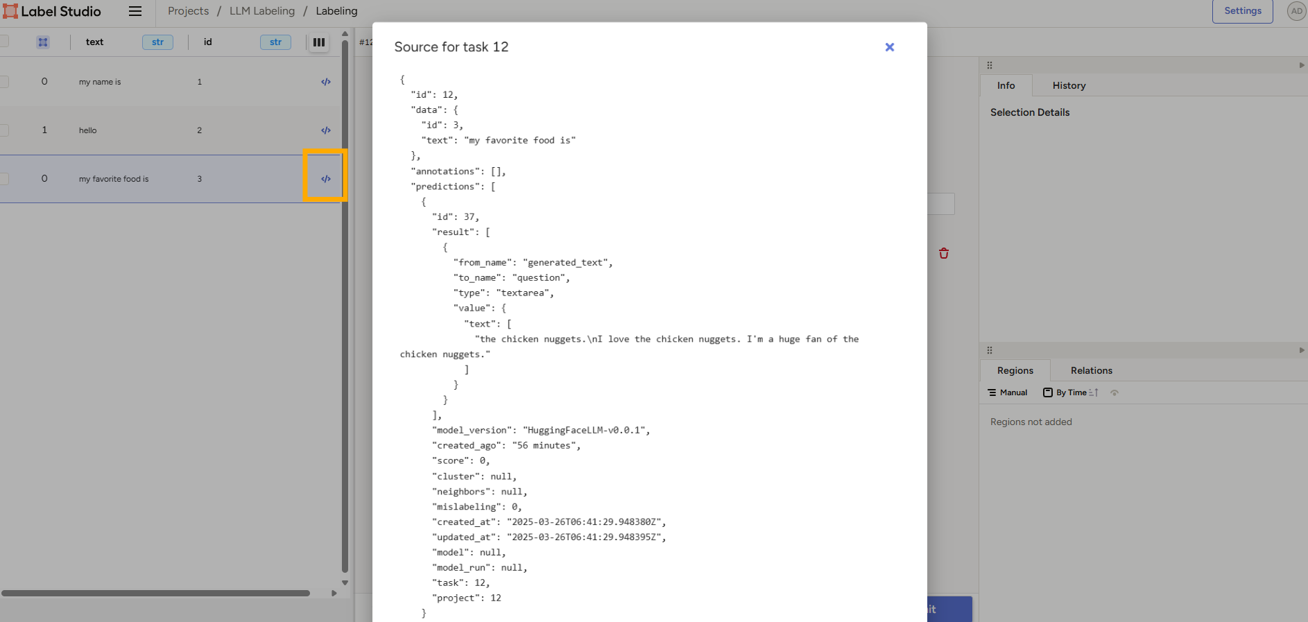 show task source 를 통해 각 데이터의 아이디(id), 입력(data), 모델 예측 결과(predictions), 레이블링된 데이터(annotatioins)를 확인할 수 있다.