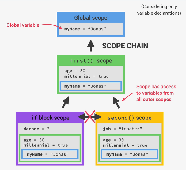 - Lexical scoping: 함수 및 블록을 코드에 배치하여 제어