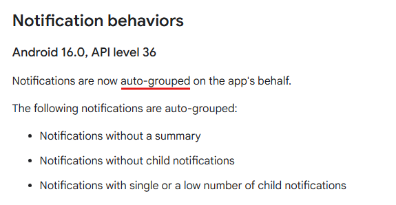 Android 16 부터 시스템이 앱을 대신하여 알림을 자동으로 그룹화(Auto-grouped) 한다. 다음과 같은 알림의 경우에 자동 그룹화가 적용된다.
