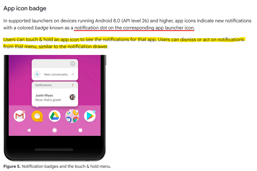 앱 실행 아이콘 옆에 notification dot 이라고 불리는 색상 배지로 notification이 나타난다.