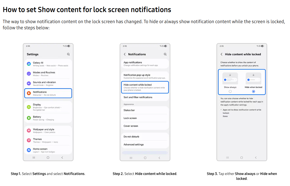 Android 8.0 이상에서 단일 앱에 존재하는 여러 채널에 대해 각각 lock screen notification 을 활성화, 비활성화 할 수 있다. (삼성 One UI 6.1 버전부터 해당 기능이 다르게 기능)