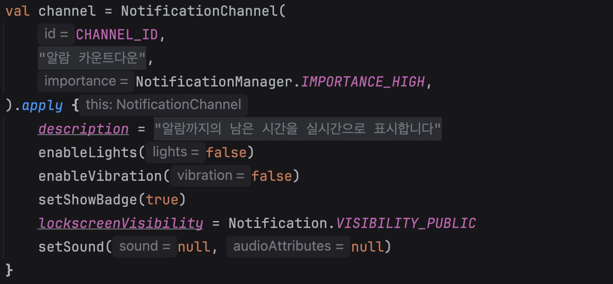 Notification Channel의 Importance는 High(Urgent)로 설정했으며, 소리와 진동은 모두 비활성화한다.