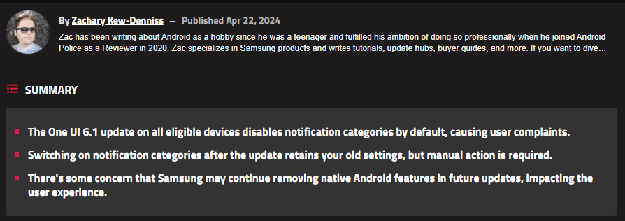 삼성 One UI 6.1 버전부터 기본 설정으로 각 notification channel 의 별도 활성화/비활성화 기능 자체가 비활성화 되어있다.