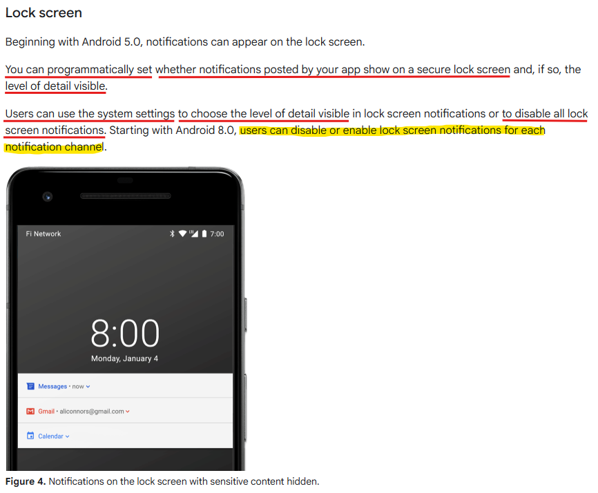 개발자 측에서 코드 개발을 통해 lock screen 에 notification 을 띄울지 말지, 띄워지는 내용의 상세 정도 (없음 - 간략 - 상세) 를 설정할 수 있다.