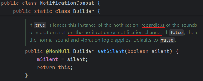 AOSP의 setSilent 메서드 가이드에 따르면, Notification Channel의 소리 및 진동 설정 여부와 관계없이 알림이 무음 처리되어 Heads-up 알림이 나타나지 않아야 한다.