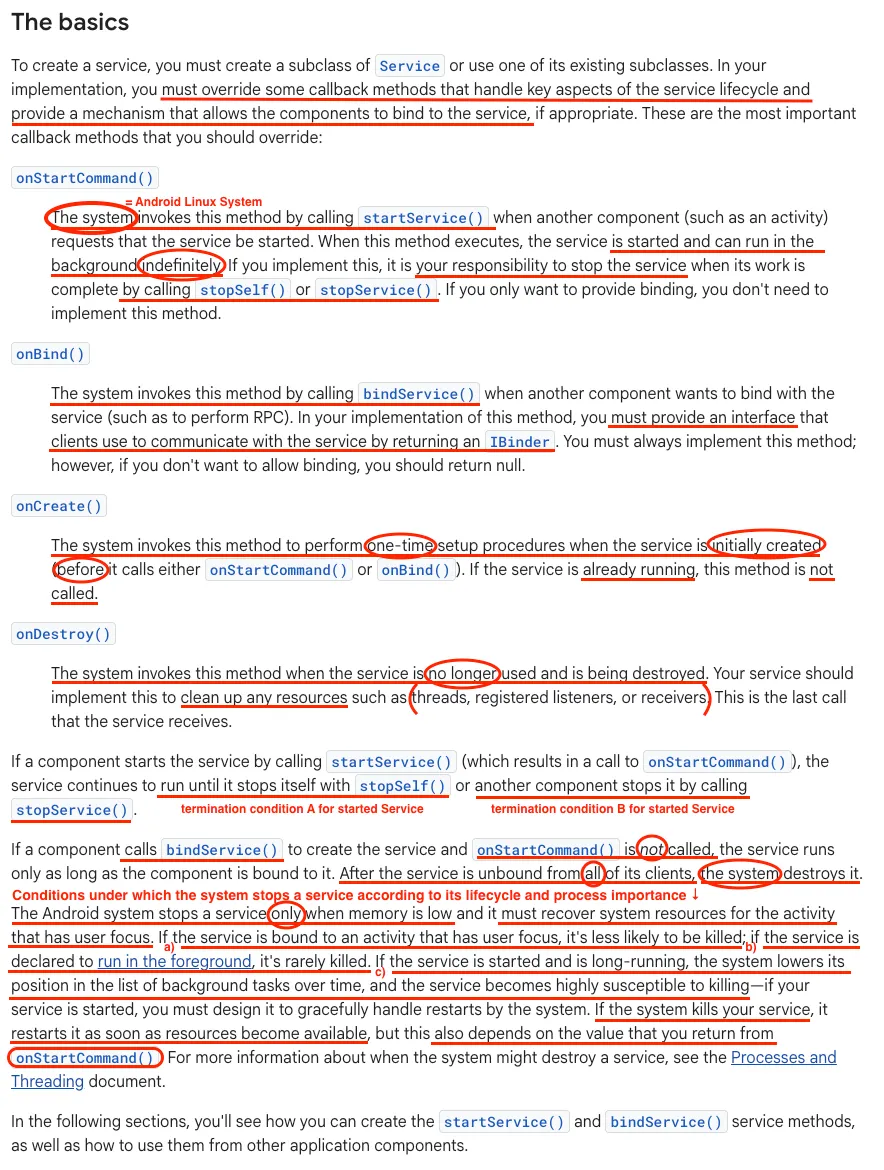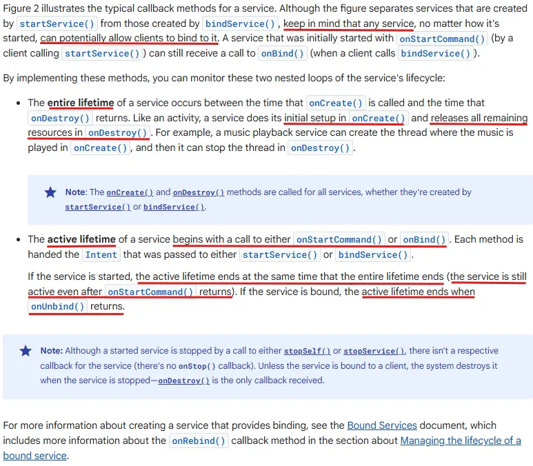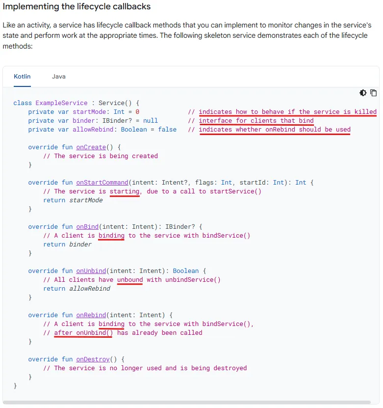 서비스를 생성하려면 Service의 서브클래스를 생성해야 하며, 수명 주기의 핵심 측면을 처리하는 콜백 메서드를 오버라이드하고 적절한 경우 구성 요소가 서비스에 바인딩할 수 있는 메커니즘을 제공해야 한다. 다음은 오버라이드해야 할 가장 중요한 콜백 메서드들이다.