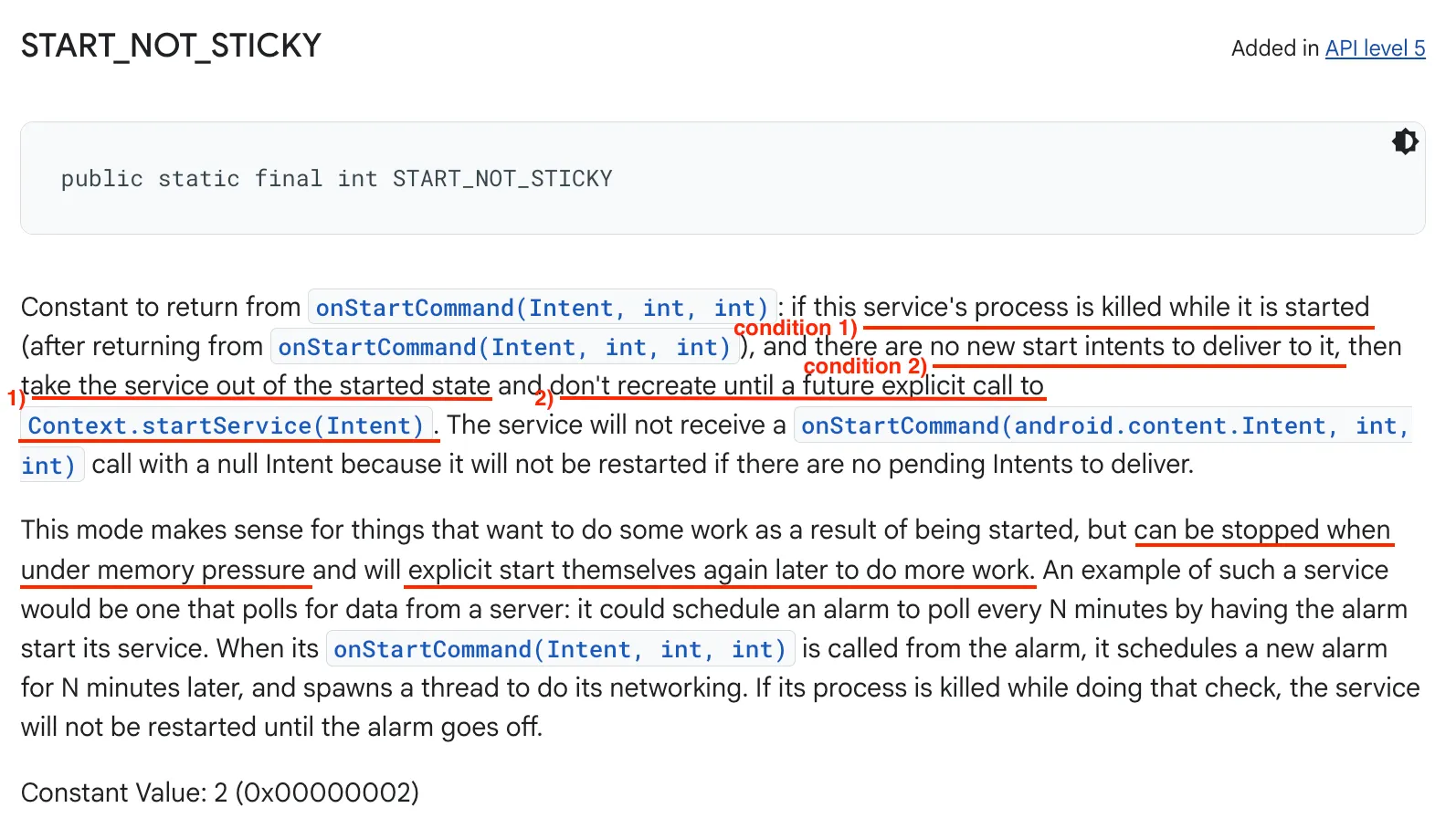 START_NOT_STICKY : 시스템이 서비스를 종료한 후, 대기 중인 새로운 인텐트가 없다면 서비스를 재생성하지 않는다. 이는 가장 안전한 옵션이며 앱이 미완성 작업을 쉽게 재시작할 수 있을 때 유용하다.