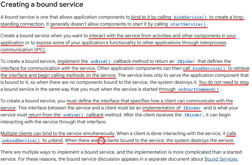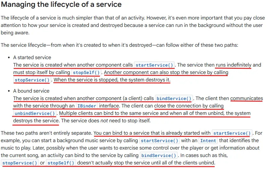 구성 요소가 startService()를 호출하여 서비스를 시작하면 서비스는 stopSelf() 또는 다른 구성 요소가 stopService()를 호출할 때까지 계속 실행된다. 반면 bindService()를 통해 생성된 경우 onStartCommand()는 호출되지 않으며, 서비스는 해당 구성 요소가 바인딩되어 있는 동안에만 실행된다. 모든 클라이언트가 바인딩을 해제하면 시스템이 서비스를 소멸시킨다.