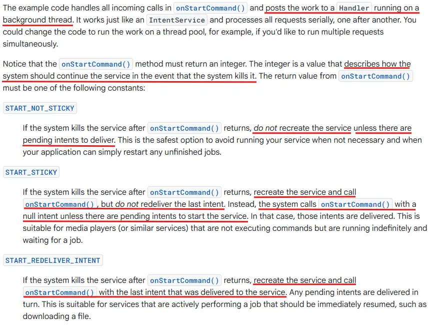 이러한 메커니즘은 서비스가 실행되는 동안 시스템에 의해 종료될 수 있음을 의미하며, 이 경우 시스템은 나중에 서비스를 다시 시작하려고 시도한다. 따라서 onStartCommand()를 비동기적으로 구현할 때는 인텐트가 유실되지 않도록 START_FLAG_REDELIVERY를 사용하는 것이 중요하다.