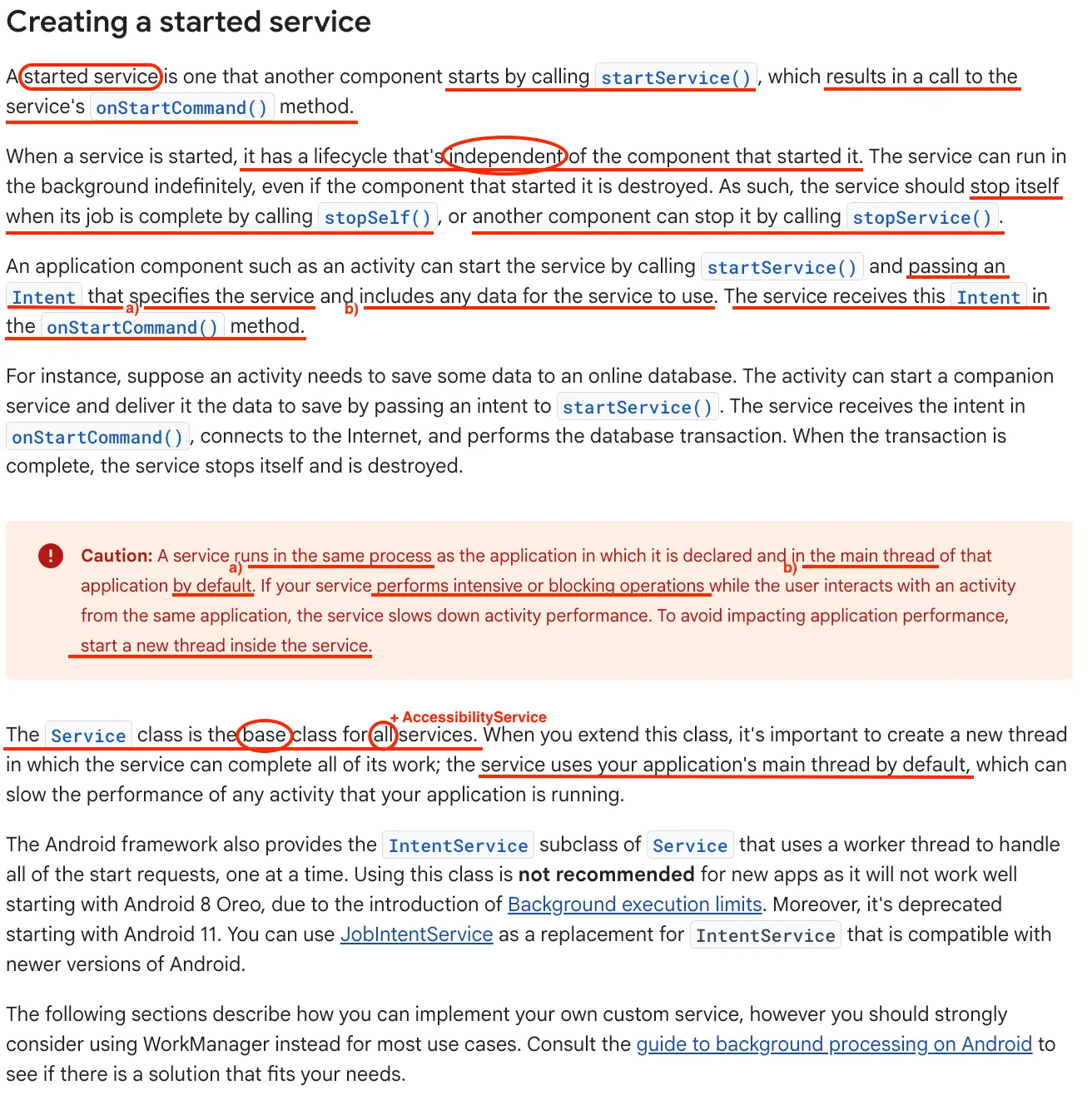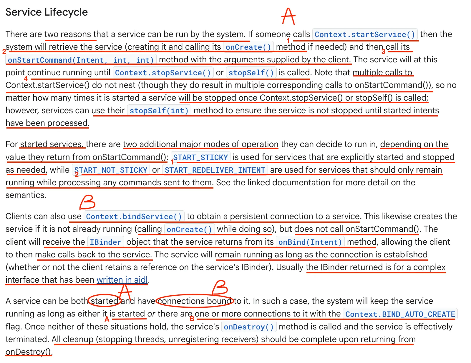 시스템(Android Linux System)은 다른 구성 요소가 startService()를 호출하여 서비스 시작을 요청할 때 이 메서드를 호출한다. 이 메서드가 실행되면 서비스가 시작되어 백그라운드에서 무기한(indefinitely) 실행될 수 있으며, 작업이 완료되었을 때 stopSelf() 또는 stopService()를 호출하여 서비스를 중단하는 것은 개발자의 책임이다.