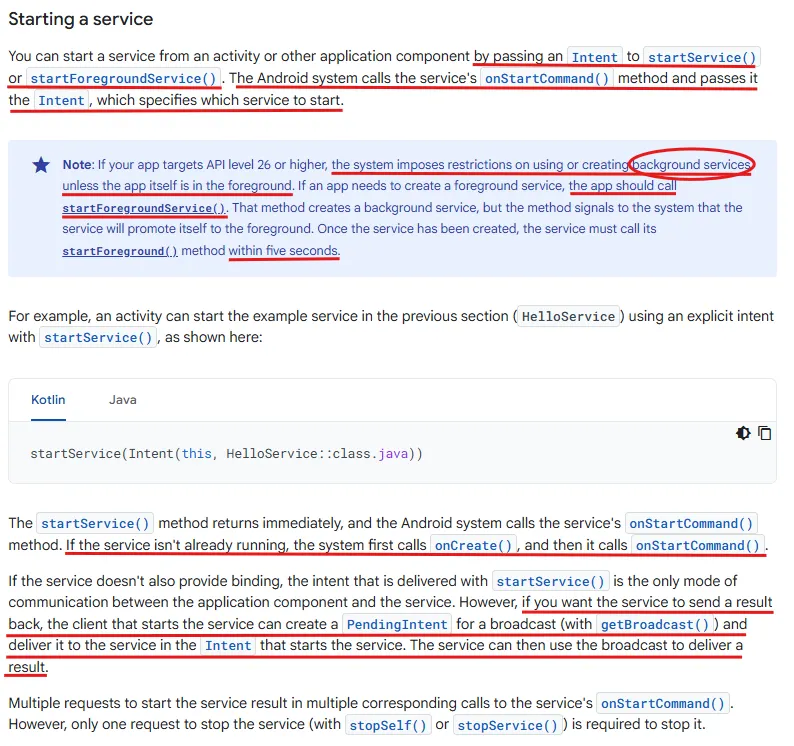 startService() 메서드는 즉시 반환되며, 서비스가 아직 실행 중이 아니라면 시스템은 먼저 onCreate()를 호출한 다음 onStartCommand()를 호출한다. 바인딩을 제공하지 않는 서비스의 경우 전달된 인텐트가 유일한 통신 수단이지만, 결과를 돌려받고 싶다면 클라이언트가 브로드캐스트(getBroadcast())를 위한 PendingIntent를 생성하여 서비스에 전달하고 서비스가 이를 사용하여 결과를 전송할 수 있다. 서비스를 시작하라는 요청이 여러 번 발생하면 여러 번의 onStartCommand() 호출이 이루어지지만, 서비스를 중단하는 데에는 단 한 번의 stopSelf() 또는 stopService() 호출만이 필요하다.
