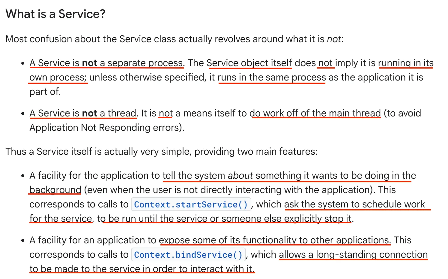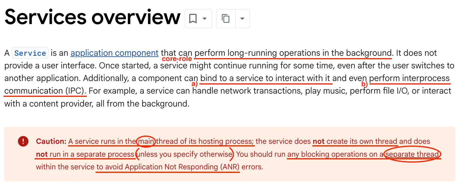 Caution : 서비스는 기본적으로 선언된 애플리케이션과 동일한 프로세스에서 실행되며, 해당 애플리케이션의 메인 스레드를 사용한다. 만약 서비스가 사용자와 상호작용 중인 액티비티가 있는 상황에서 집약적이거나 차단 작업(intensive or blocking operations)을 수행하면 앱의 성능이 저하될 수 있다. 이를 방지하기 위해 반드시 서비스 내부에 새로운 스레드를 시작하여 작업을 수행해야 한다.