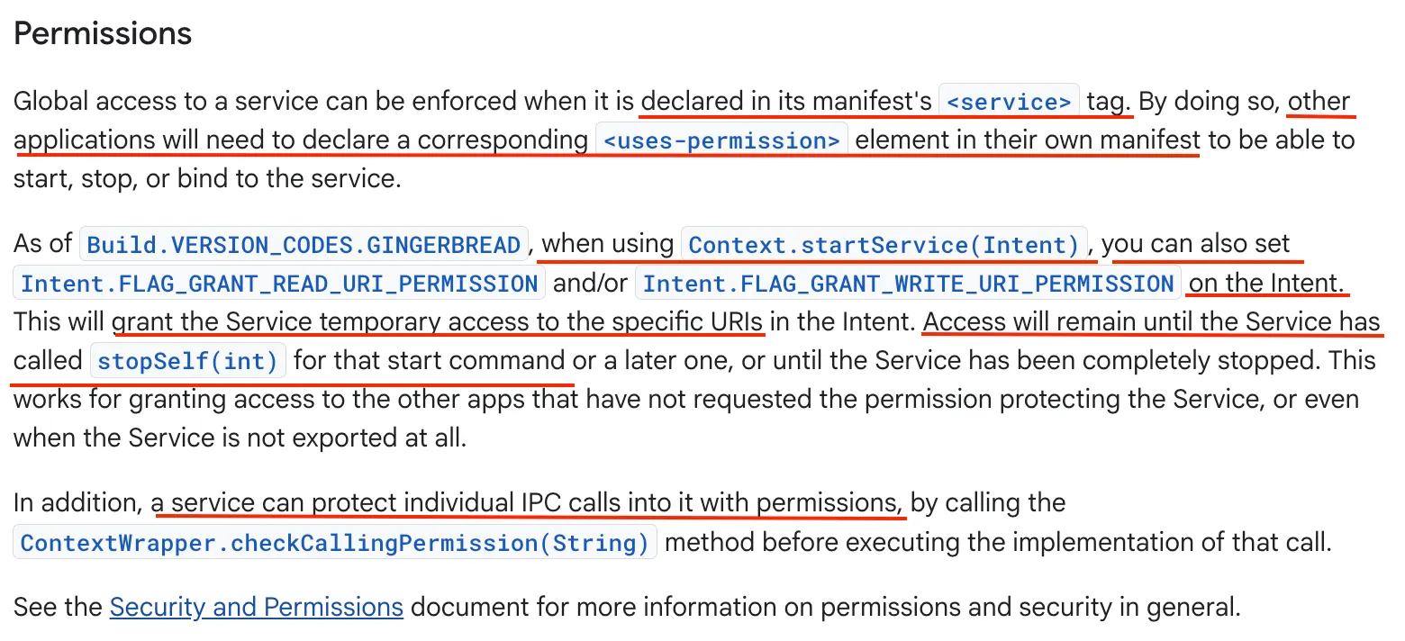또한 Context.startService(Intent)를 호출할 때 인텐트에 FLAG_GRANT_READ_URI_PERMISSION 또는 FLAG_GRANT_WRITE_URI_PERMISSION 플래그를 설정할 수 있다. 이를 통해 서비스에 인텐트에 포함된 특정 URI에 대한 임시 접근 권한을 부여할 수 있으며, 이 권한은 서비스가 해당 명령에 대해 stopSelf(int)를 호출하거나 완전히 중단될 때까지 유지된다. 이러한 방식은 서비스가 외부로 노출(exported)되지 않은 상태에서도 다른 앱에 권한을 부여하는 수단으로 활용된다.