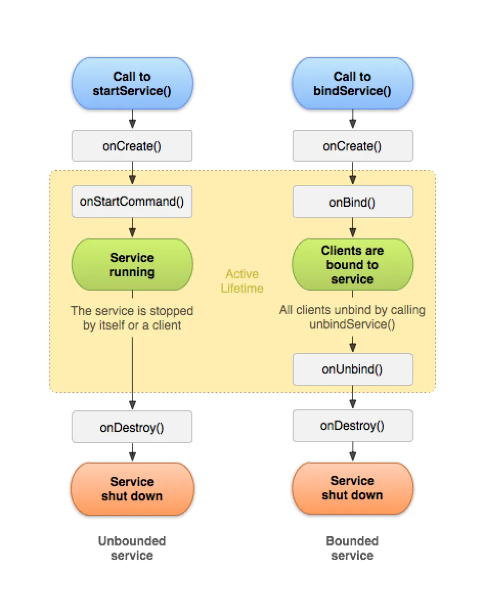 Started service 의 경우 onStartCommand() 호출과 함께 시작되어 전체 생존 기간이 끝날 때까지 유지되며, Bound service 는 onBind() 호출 시작되어 onUnbind()가 반환될 때 종료된다.