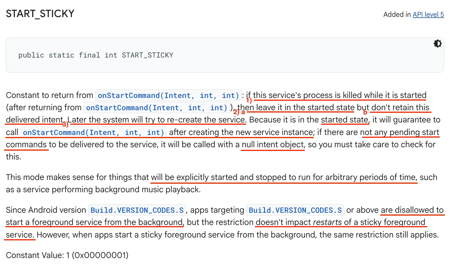 START_STICKY : 시스템이 서비스를 강제로 종료한 후 서비스를 재생성하지만, 마지막 인텐트를 다시 전달하지는 않고 null 인텐트로 호출한다. 이는 음악 플레이어처럼 무기한 실행되면서 작업을 기다리는 서비스에 적합하다.