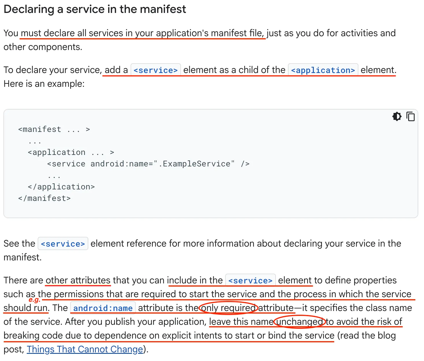 애플리케이션을 게시한 후에는 서비스를 시작하거나 바인딩하기 위한 명시적 인텐트(explicit intents)에 대한 의존성으로 인해 코드가 망가질 위험을 방지하기 위해 이 이름을 변경하지 않고 유지해야 한다.
