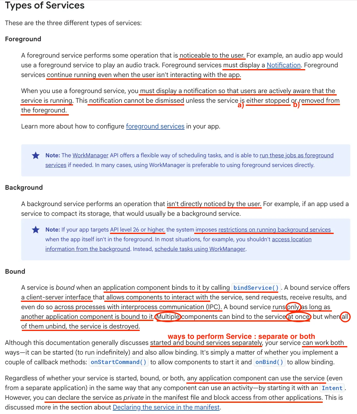 참고: API 레벨 26(Android 8.0) 이상에서는 앱이 포그라운드에 있지 않을 때 백그라운드 서비스 실행에 제한(Restrictions)이 따르므로, WorkManager를 사용하여 작업을 예약해야 한다.