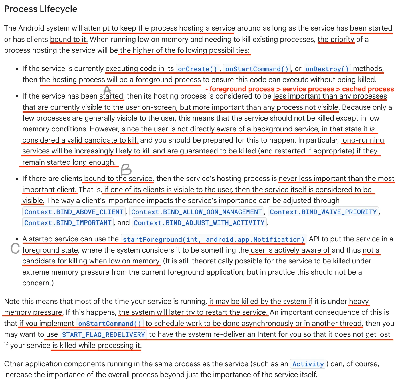 안드로이드 시스템은 서비스가 시작되었거나 클라이언트가 바인딩되어 있는 한, 해당 서비스를 호스팅하는 프로세스를 유지하려고 시도한다. 메모리가 부족하여 프로세스를 종료해야 할 때, 호스팅 프로세스의 우선순위는 다음 가능성 중 가장 높은 것을 기준으로 결정된다.